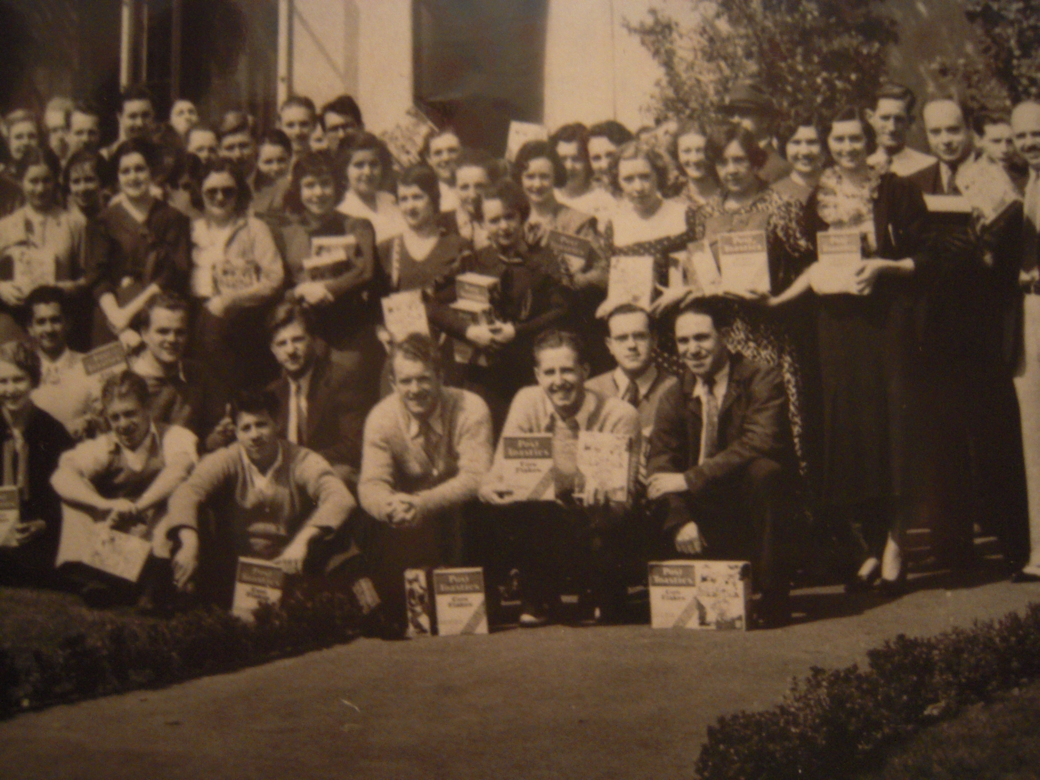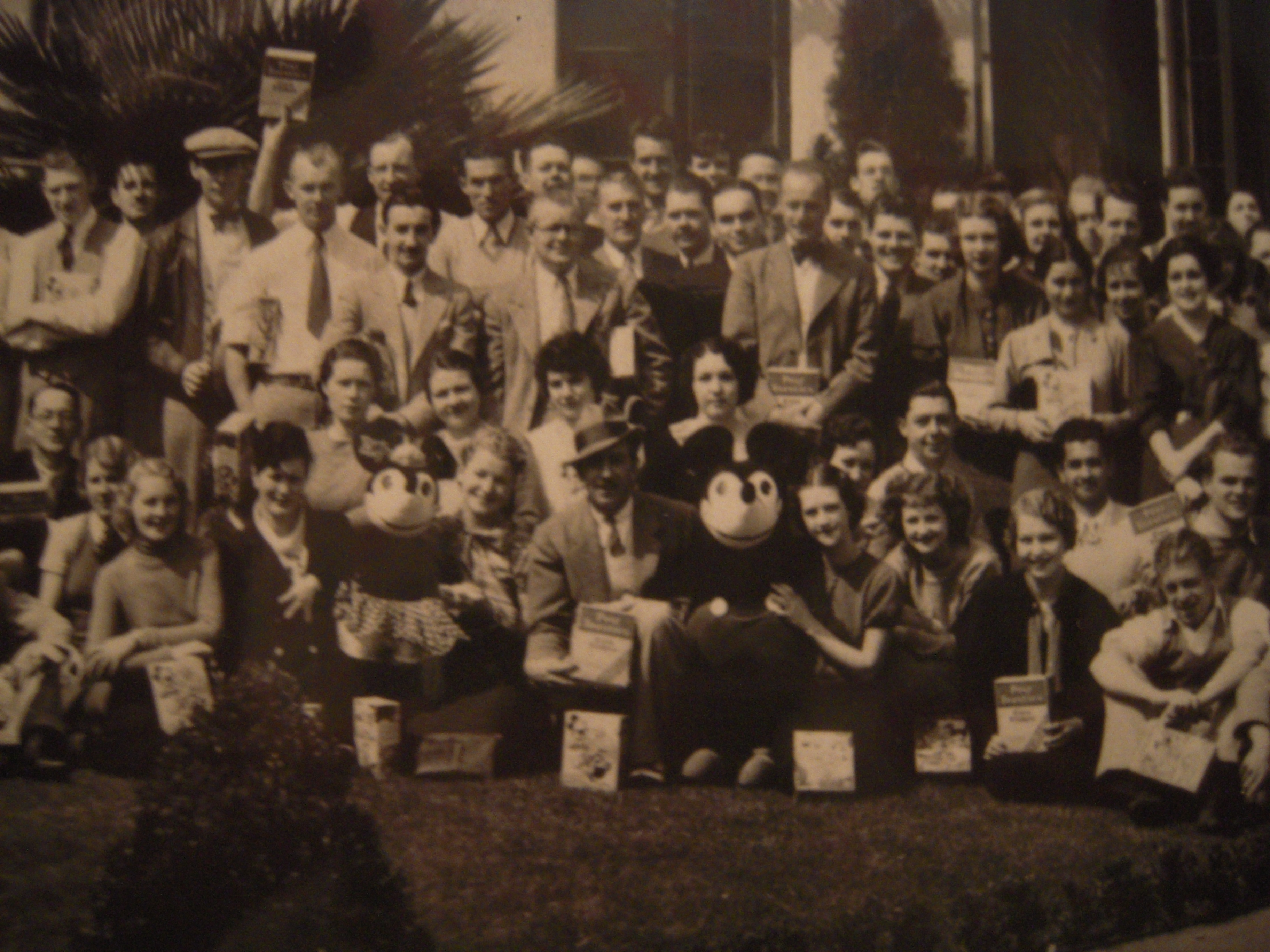 This picture of the entire Disney staff was probably taken some time in late 1933 or early 1934. The staff is holding boxes of Post Toasties. Walt and his brother Roy had hired Herman “Kay” Kamen to merchandise the Disney brand in 1933, and soon Mickey was on wristwatches and breakfast cereals. Suddenly the Mouse went from movie star to household brand all of his own, and Walt was able to afford to make the expensive, experimental cartoons he wanted.
