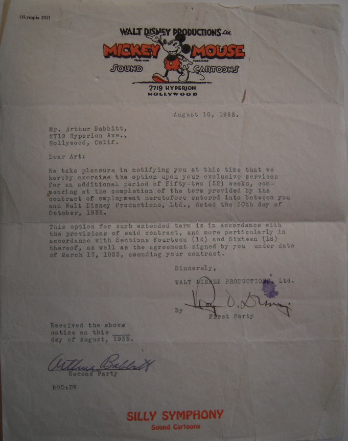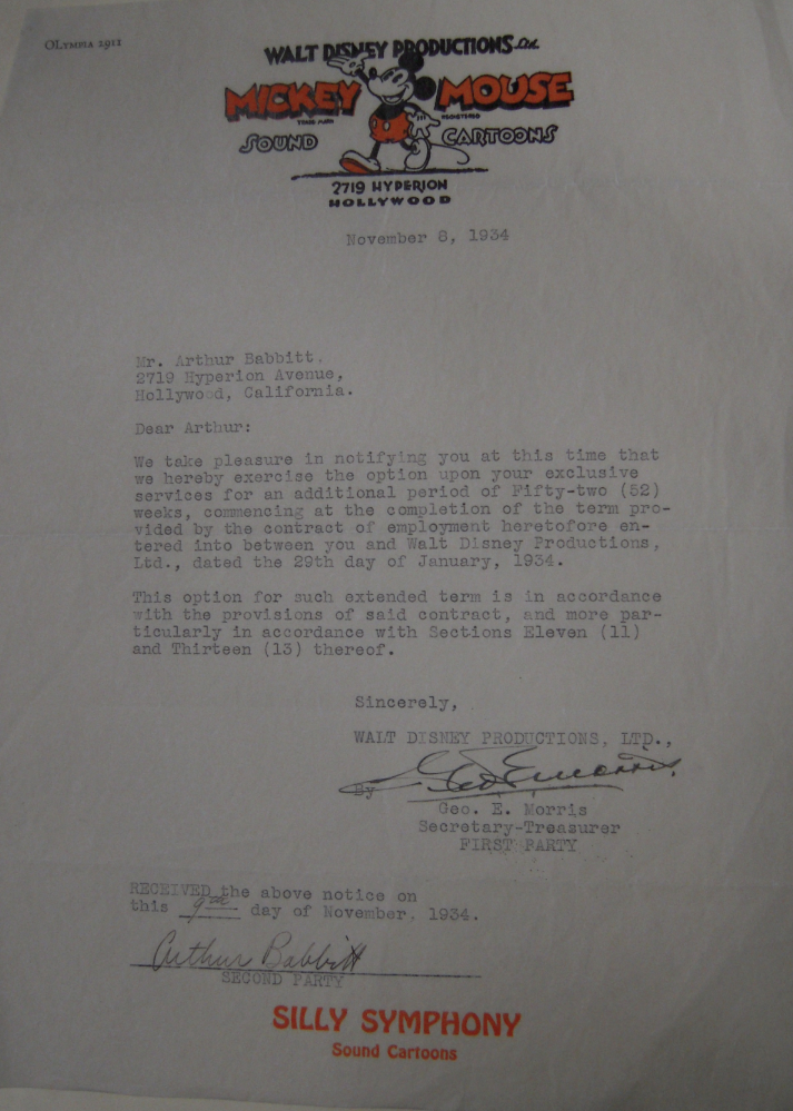 Roy Disney was Walt’s older brother. While Walt was the creative side of this family business, Roy was the business side. In 1934, Roy Disney signs Art Babbitt into the company with the contract below.