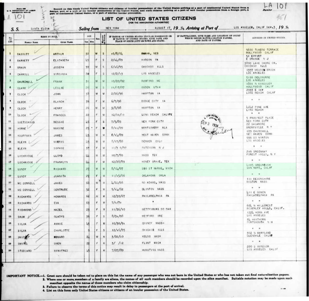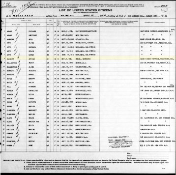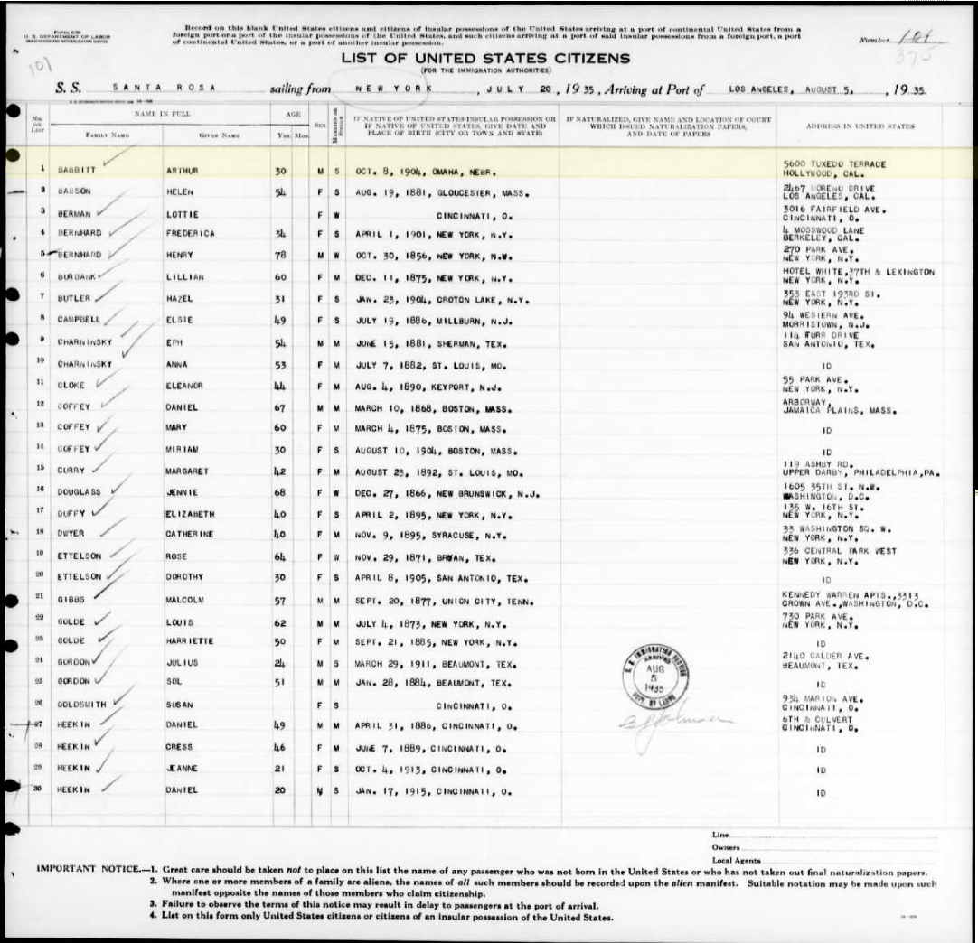 On July 20th, 1935, Art Babbitt traveled by ship from New York, to arrive in Los Angeles on August 5th.