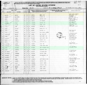 Flash forward three years. Snow White is a hit, and they’re working on Pinocchio and Fantasia. Walt Disney and his whole family – wife, daughter, brother, sister-in-law, nephew – depart Honolulu, Hawaii on Sept 29, 1939 and arrive in Los Angeles on Oct 4.
