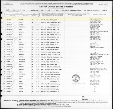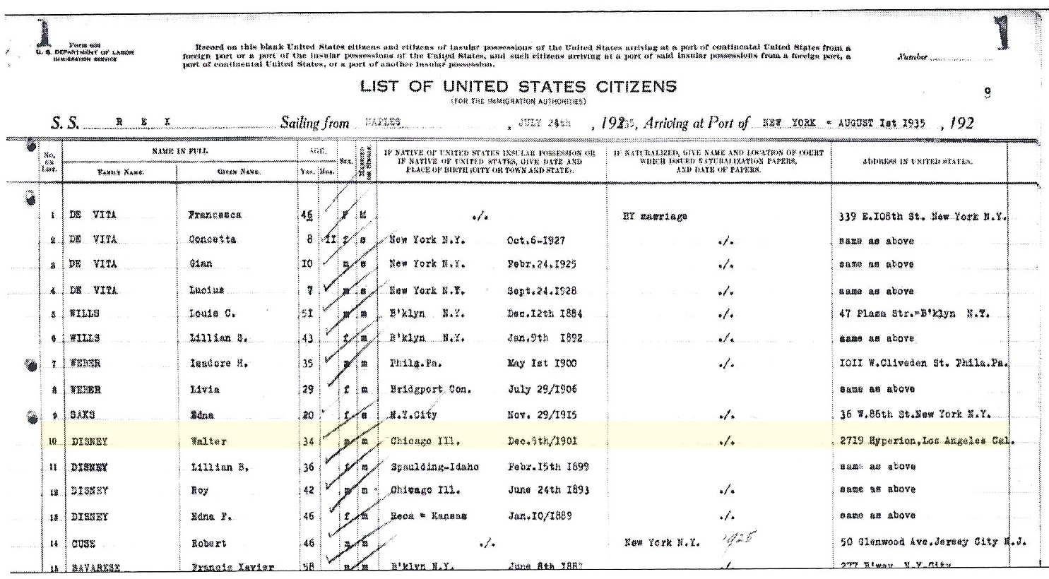 On July 24th that year, Walt Disney, his wife, brother and sister-in-law departed Naples, Italy and arrived in New York on August 1st. For their home address, they all put down that of the Disney animation studio on Hyperion Ave.