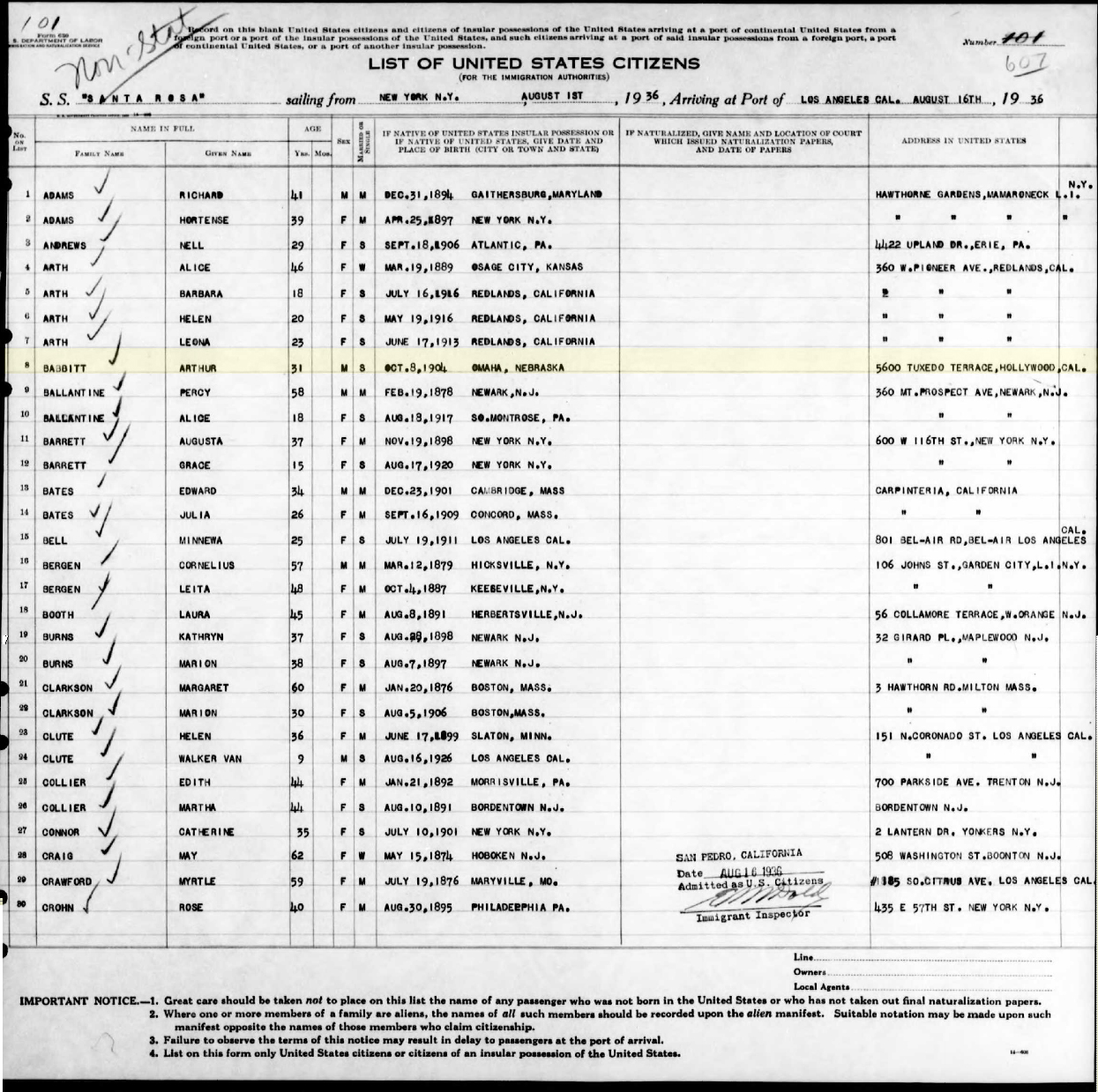 On August 1st, 1936, Art Babbitt departed New York to arrive in Los Angeles on August 16th.