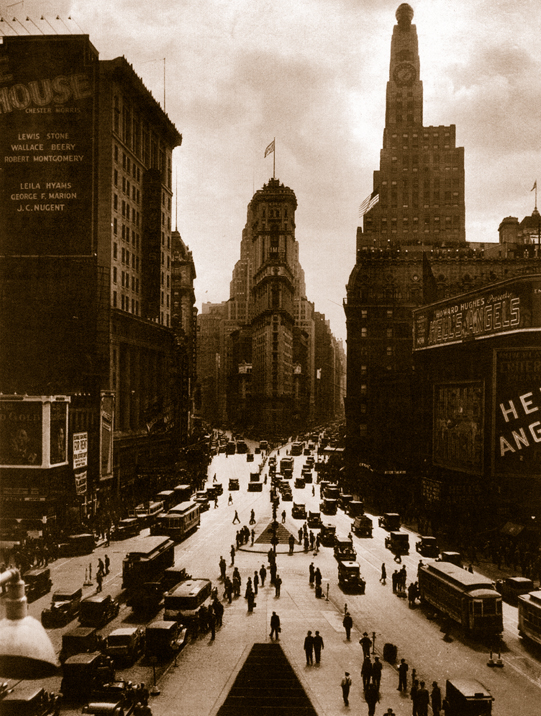 Arthur was evicted from his office when the building was set to be demolished to make way for the new Ethel Barrymore theater, and by May of 1928 (according to the White Pages), Arthur relocated his business a couple blocks away, closer to Times Square proper, at 1587 Broadway, on 49th street. Four blocks south was the famous intersection of 7th avenue and Broadway, and at the end of a long day, the bright lights of the square would begin to illuminate the dark. In 1928, the public would gather around the Times building to read the brand new scrolling news feed across the outer facade. Stepping out of his building on the west side of Broadway and facing south, this is what Arthur would see.