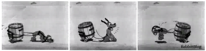 On his desk, Sharpsteen had some folders of drawings for the latest short that Jackson was directing, Touchdown Mickey. He picked up a short Pluto scene: Pluto walks and sniffs to the right, sees the mob and runs to the left. The extreme poses were already done, but it needed the inbetweens. Could this new Babbitt fellow animate a four-legged walk cycle, a jump and a four-legged run, and convincingly stick to the pup’s change in emotions?