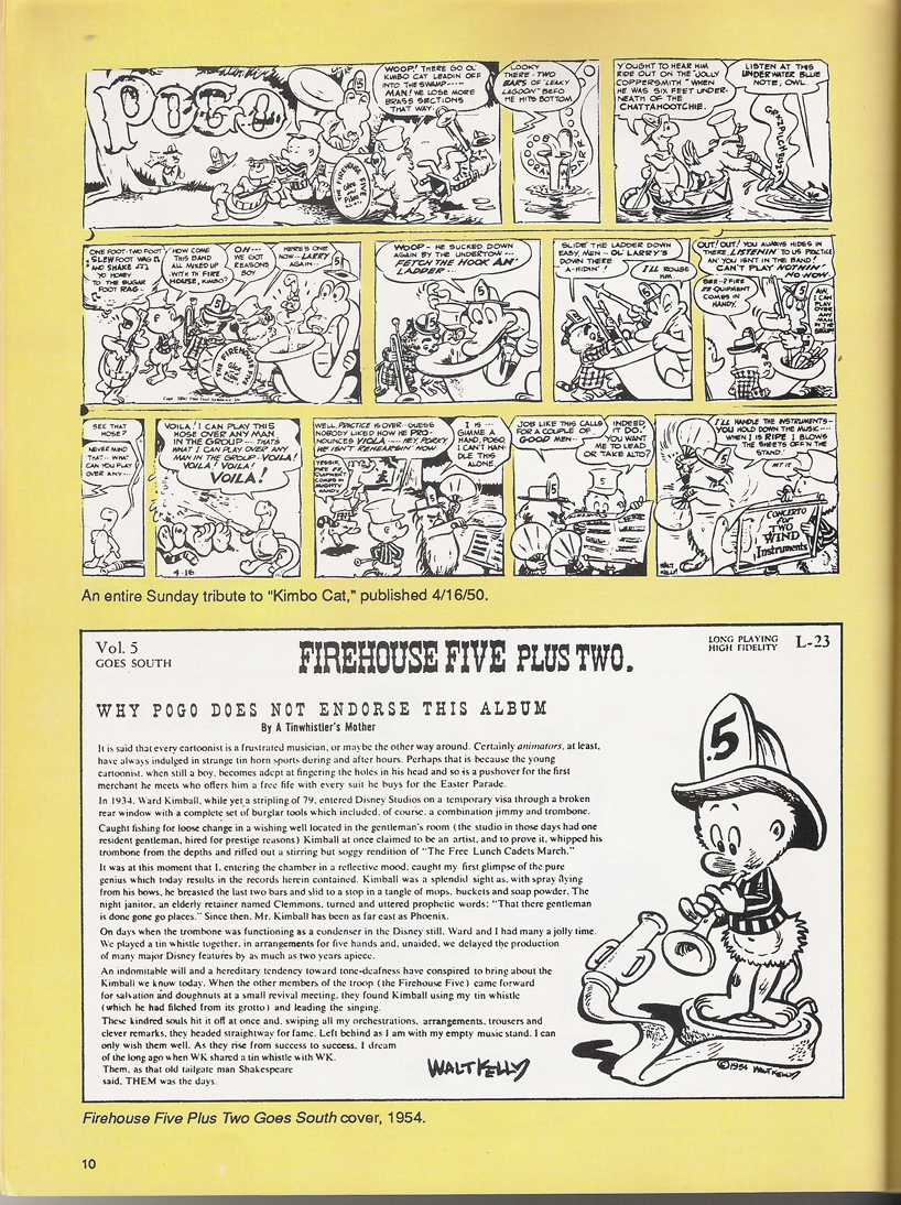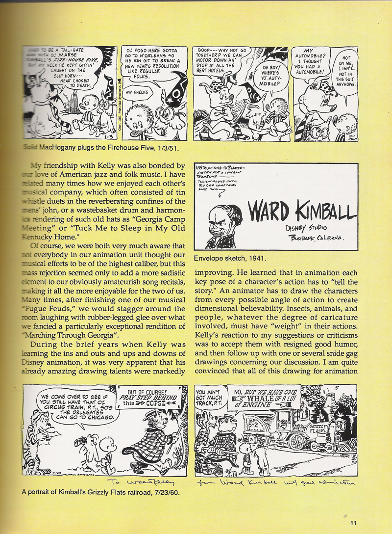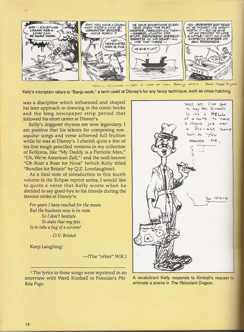 The quirky friendship between Kimball and Kelly is one of my personal favorite bits of Disney history, if only for their stories of hijacking the bathroom to play old-timey American standards on the tin-whistle, harmonica and waste-paper basket. To me, this is what Golden Age of animation is all about. But read it for yourself in Kimball’s own words, as prefaced in Eclipse Books’ Pogo and Albert #4.