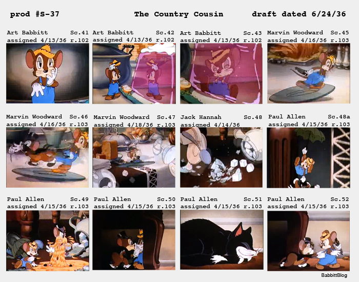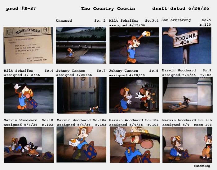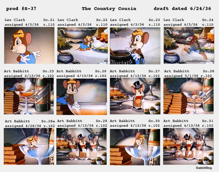 One of Babbitt’s greatest animated sequences is of drunken Abner, the Country Mouse, in Disney’s Oscar-winning short, “The Country Cousin” (1936). This mosaic of the animator draft not only includes the names of the artist for each scene, but also his room number and the date the scene was assigned.
