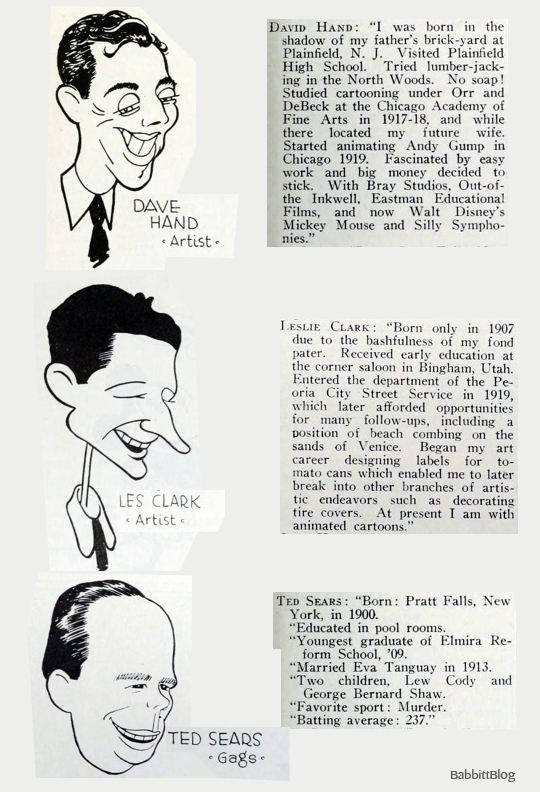 Half by accident, half by definite purpose, I stumbled upon an auction of Disney memorabilia and in it was included a page of a magazine called Motion Picture Daily. It had caricatures of Disney staffers from the early ’30s. After a little internet research, I was able to locate high rez pix of not only that page, but its adjoining pages. What I was able to reap was not caricatures (by Disney artist Jack King) of the 1931 Disney staff, but also brief autobiographical artist profiles that give a window into the youthful and playful behavior of these young creatives. I’ll post a few of these over the course of the next few days.