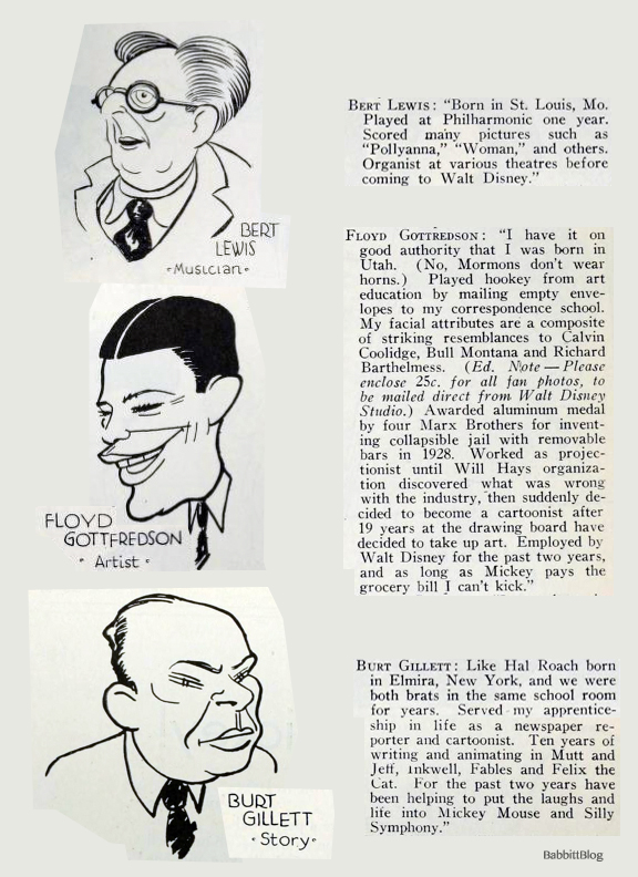 Here in the continued auto-bios of the Disney staffers, Bert Lewis lists his creds, Floy Gottfredson touts his own good looks, and Burt Gillett name-drops.