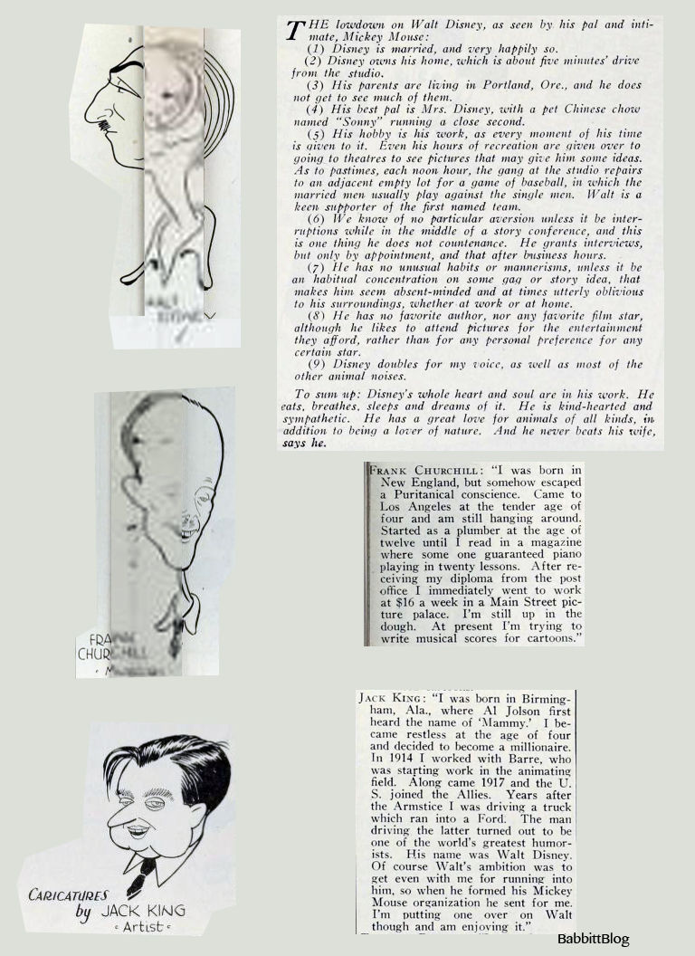 In this, the final installment of snippets from the June 20, 1931 issue of Motion Picture Daily, I had to composite some various images together to doctor a complete caricature of Walt and Frank Churchill. Enjoy this glimpse at Walt Disney, musician Frank Churchill and Jack King, and I’ll see you out West!