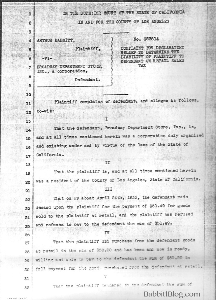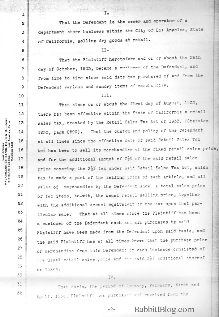 California state retail sales tax had just been established on August 1 1933, charging 2 ½ % on each purchase. Babbitt became a customer of the store that October. The store’s policy “at all times since the effective sate of said Retail Sales Tax Act has been to sell its merchandise at the fixed retail sales price, and for the additional amount of 2½% […]and all sales of merchandise by the Defendant show a total sales price of two items [ i.e .] the usual retail selling price, together with the additional amount equivalent to the tax upon that particular sale.”