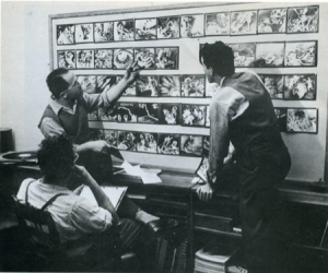 A UPA story meeting for “Sparks and Chips” with Zack Schwartz (below) and Steve Bosustow (right), 1943